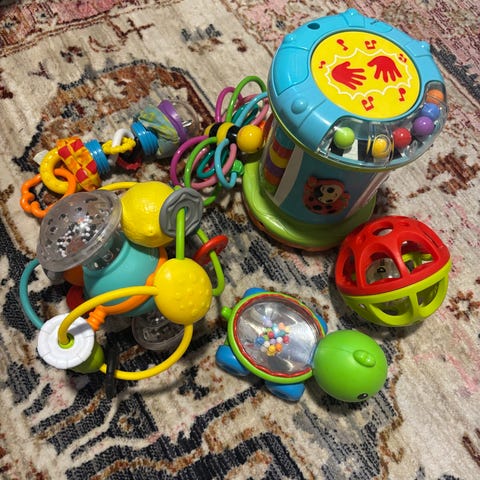 Done by Deer aktivitetsmatte for barn med mykt underlag og oppheng for lekefigurer. Passer for små barn for å stimulere motorikk og sansene.