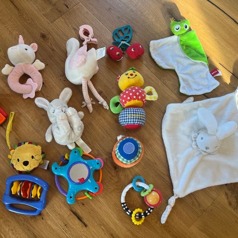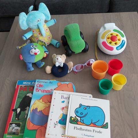 Ulike leker og tilbehør for barn, nøkler med lyd, fjernkontroll med lyd, og en rund leke med diverse dyrelyder og mangen kjekke ting som kan flyttes.