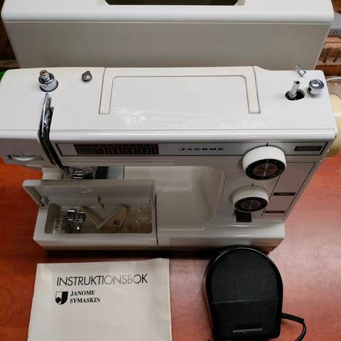 Alt originalt utstyr følger med. Ekstra som følger med er noen symaskinføtter som for usynlig glidelås, non stick fot, skråbåndsfot(fast stoff), strikkfot.