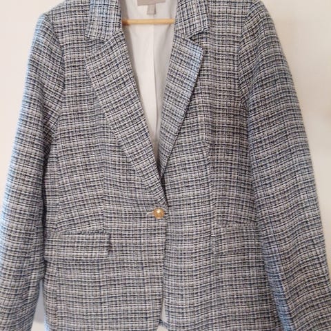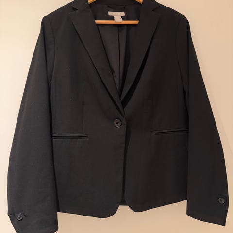 H&M blazer i størrelse 44 for kvinner. Jakken er svart og laget av 100 % polyester, inkludert fôr. Passer til formelle eller uformelle anledninger.