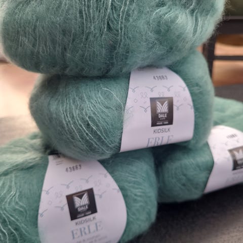 1 hespe (50 gram) ubrukt Kvitlammet Brushed Kid Silk i fargen Addams Family selges, da den ble til overs. Håndfarget garn.
