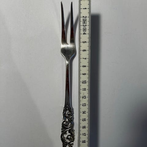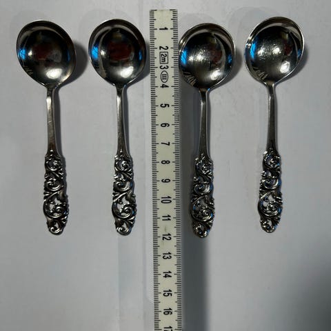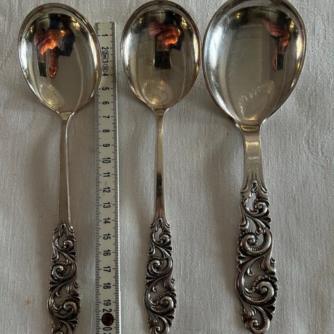 Har også koldtgafler, paispader, sukkerskjeer, stor anretningsskje 21,5, syltetøyskjeer 12,5 og 14,5, smørgafler, liten serveringsspade, kakegafler 13,8, ostehøvel 22,5, potetskje 21,5,