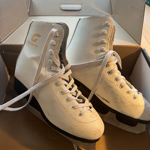 Danseskøyter/kunstløpskøyter i størrelse 36. Skøytene er hvite med rosa skolisser og har myk, foret innside for komfort. Pent og lite brukt.
