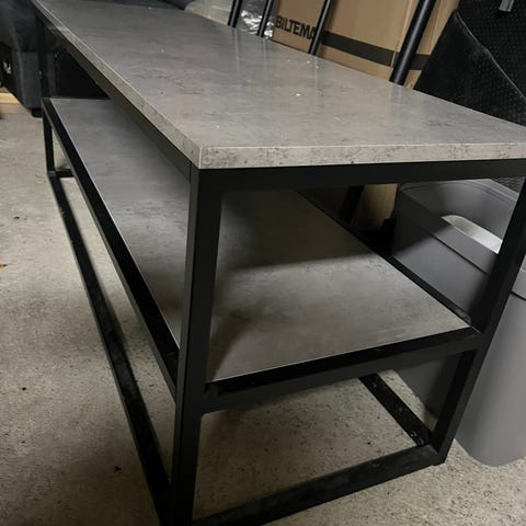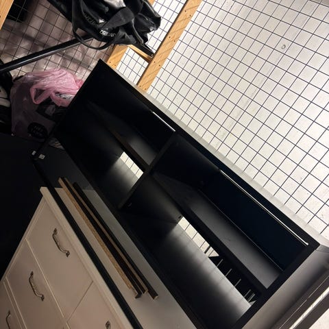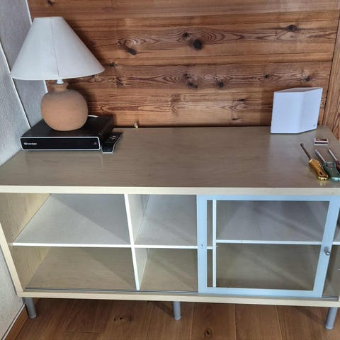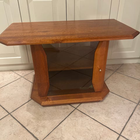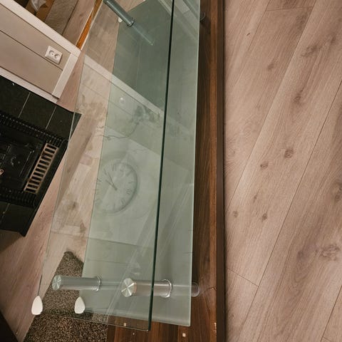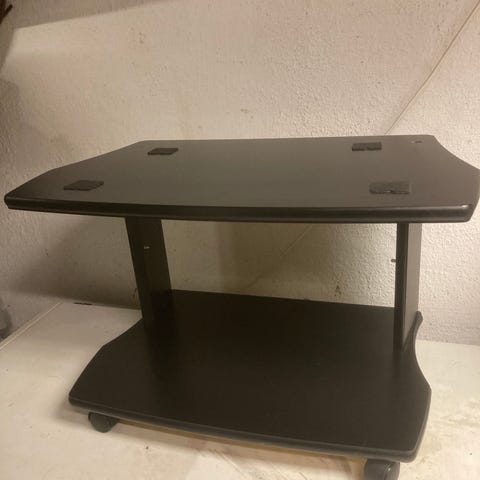 Fint tv bord uten bruksmerker. Har tre hyller til å legge ting på og to hull bak til å få gjennom ledninger. Greit for en liten tv.