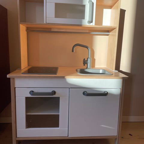 IKEA DUKTIG lekekjøkken i tre med komfyr, ovn, vask og mikrobølgeovn. Passer til lek og rollelek i barnerom eller lekerom. Følger med diverse tilbehør: kasseroller og lekemat .