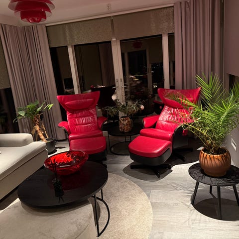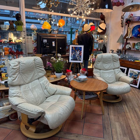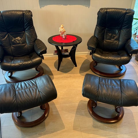 2 gode stressless lenestoler i skinn , med fotskammel ,