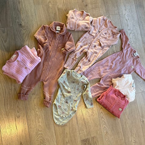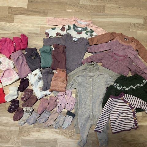 Selger stor klespakke/32 plagg med varme, myke og gode vinterklær til jente i str 62 og 68. Noe er helt nytt og ubrukt, noe er nesten ikke brukt, så her får du mye for pengene 😍