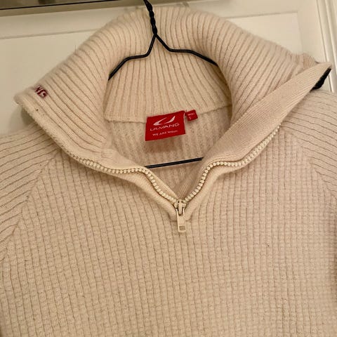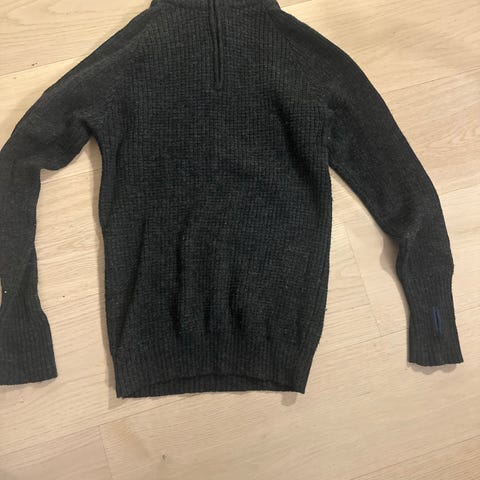 Pent brukt genser, glidelås i halsen og hull til tomler.