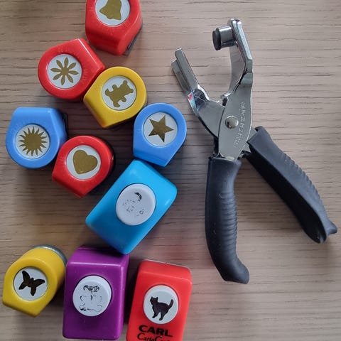Multibond Punch Set stansesett med 11 forskjellige stansformer for papir. Inkluderer flere størrelser og motiver for kortlaging og dekorasjon. Leveres i plastkoffert for enkel oppbevaring og transport. Ikke brukt.