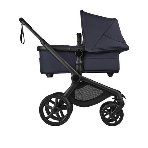 Bugaboo barnevogn i beige farge med svart ramme. Barnevognen har justerbart håndtak, solskjerm og oppbevaringskurv under setet. Fire hjul, hvorav to større bakhjul og to mindre forhjul. Har sikkerhetssele.