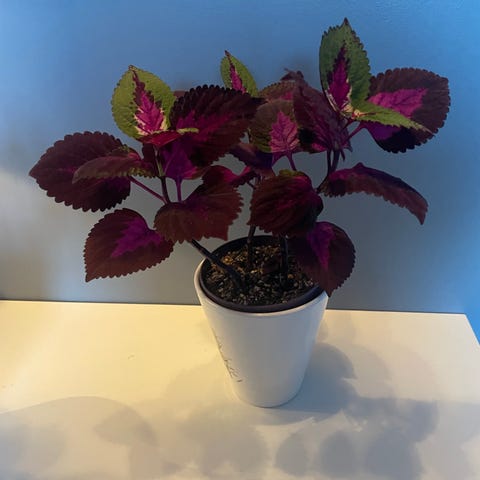 Coleus plante med karakteristiske flerfargede blader i grønne, gule og burgunder nyanser. Planten er egnet for innendørs bruk og krever moderat lys og vanning.selges uten potte