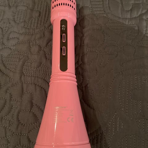 En liten mikrofon for barn som liker å synge. Volum og ekko kan justeres. Mikrofonen kommer med laderkabel, og lades på baksiden. Mikrofonen lager lyd når det nærmer seg tomt batteri. Hold inne på knappen for å skru den på. Og klikk en gang for å skru den av.