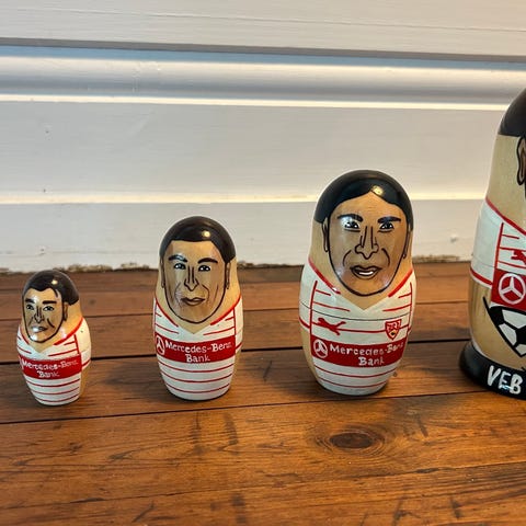 Sett med matryoshka-dukker som forestiller spillere fra Liverpool FC fra sesongen de vant CL i 2005. Hver dukke er malt med klubbens farger og detaljer som spillernavn og nummer. Laget i tre og håndmalt.