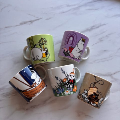 Arabia Mummi krus i ulike farger med motiver fra Mummitrollet.