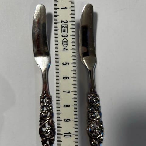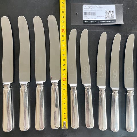 Har også koldtgafler, paispader, sukkerskjeer, stor anretningsskje 21,5, syltetøyskjeer 12,5 og 14,5, smørgafler, liten serveringsspade, kakegafler 13,8, ostehøvel 22,5, potetskje 21,5,