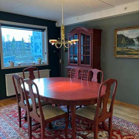 Brukte møbler. Noen småskader, men vil påstå at de likevel er pent brukt.Kan selge spisemøbler og skap/tv-benk/hylle hver for seg eller samlet. Spisestue:2000 skap/tv-benk/hylle: 3000 Priser kan diskuteres