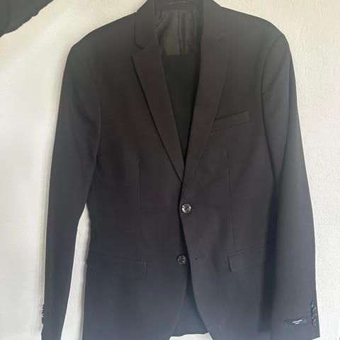 Dressmann Ullmiks Dressjakke i størrelse 48 short for herre. Bukse str 32/30. Jakken er svart og laget av ullmateriale. Slimfit. Meget pent brukt. Selges kr 800,- for hele dressen.