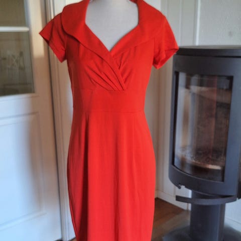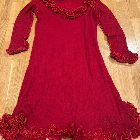 Nydelig kjole i størrelse S eller smekker som det står på :) Dette er en kjole laget til meg, og er designet av Edel Design på Helgøya - midt i Mjøsa. Når denne ble laget var det kun produsert to tidligere, en hvit og en blå som jeg har lånt bilde av for å vise hvordan kjolen er på. Min kjole er 98 cm foran og 140 bak. Den er laget i ullmateriale. Denne er brukt kun to ganger og ser helt ny ut. Kjolen har vært pakket ned i bomullsklede og plast, og oppbevart i fryseren for å unngå møll.