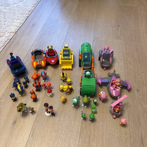 Mange kule kjøretøy og figurer fra Paw Patrol.