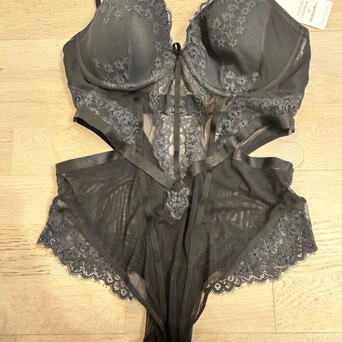 Hunkemöller Together Tomorrow S body i svart farge, laget av polyamid. Bodyen har lange ermer, halvhøyt halslinje og halterneck-design med åpen rygg. Den kombinerer blonder og mesh-stoff, og har lukkes med trykknapper nederst. Passformen er voluminøs og delvis gjennomsiktig.