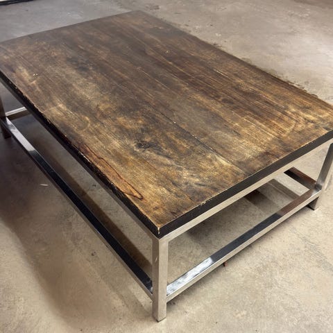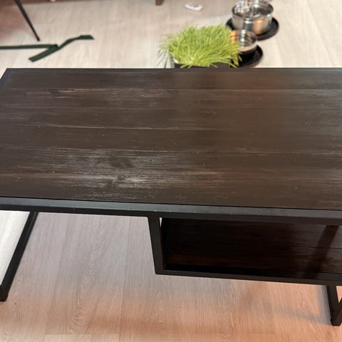 Originalt dBodhi sofabord kjøpt hos Living i gjenbrukstre (reclaimed wood) med solid sort/grått stålunderstell. Håndlaget bord med unikt patchwork-uttrykk, naturlige fargevariasjoner og spor av tidligere bruk- ingen borde er like.