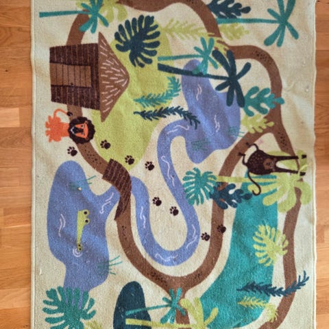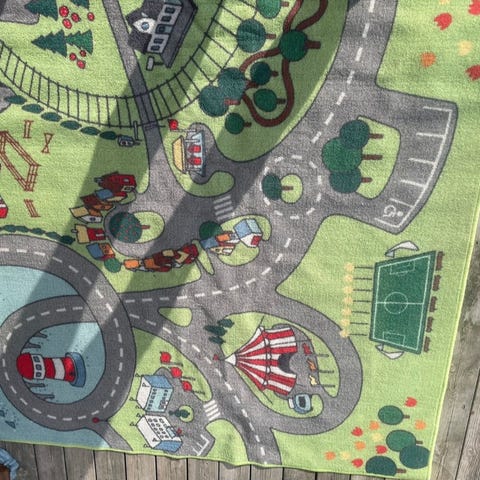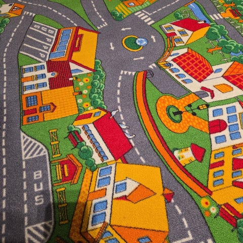 Barneinteriør lekematte med vei- og bymotiv. Lekematten har fargerikt design med veier, bygninger, trær og lekeområder, egnet for barn. Materialet er mykt og egnet for lek på gulvet.