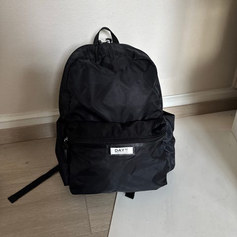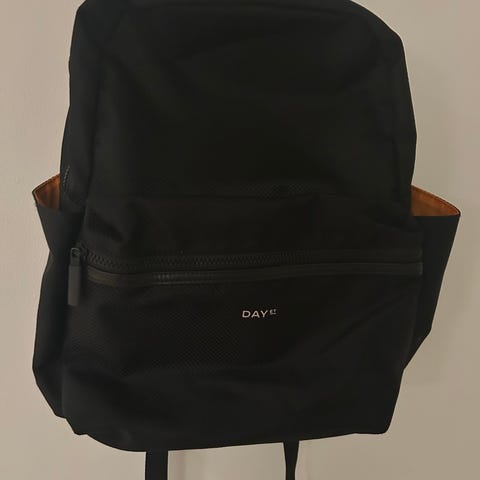 DAY ET sport Logo ryggsekk for unisex i sort farge, laget av nylon. Sekken har flere lommer inkludert en frontlomme med glidelås, justerbare stropper med DAY ET-logo, og et romslig hovedrom med oransje innside og ekstra innerlomme med glidelås. Designet for praktisk bruk og oppbevaring. Kjøpt på Illums Bolighus, helt ny med lapper på.
