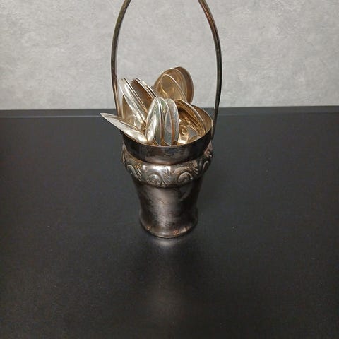 Har også koldtgafler, paispader, sukkerskjeer, stor anretningsskje 21,5, syltetøyskjeer 12,5 og 14,5, smørgafler, liten serveringsspade, kakegafler 13,8, ostehøvel 22,5, potetskje 21,5,