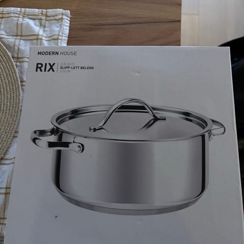 Kasserolle- sett bestående av tre kjeler i ulike størrelser og farger (blå, rosa og rustfritt stål). Alle kjelene har non-stick belegg, og håndtak i metall eller tre for enkel håndtering. Passer til generell matlaging og oppvarming av væsker. Selges pga. de ikke går til induksjon.