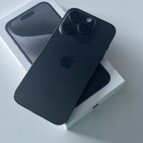 Selger en iPhone 15 Pro 256 GB i fargen Blue Titanium, kommer med original eske, ladekabel og kvittering fra Telenorbutikken i Sandefjord.