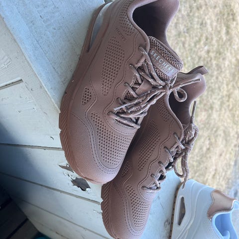 Skechers Sneakers joggesko i størrelse 39 med burgunder farge. Skoene har et pustende mesh-materiale og er designet for komfort og daglig bruk.