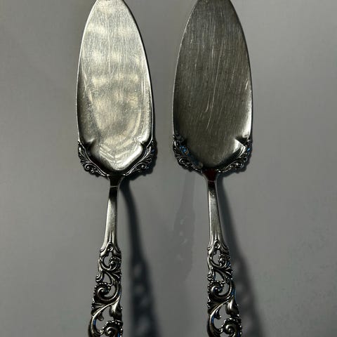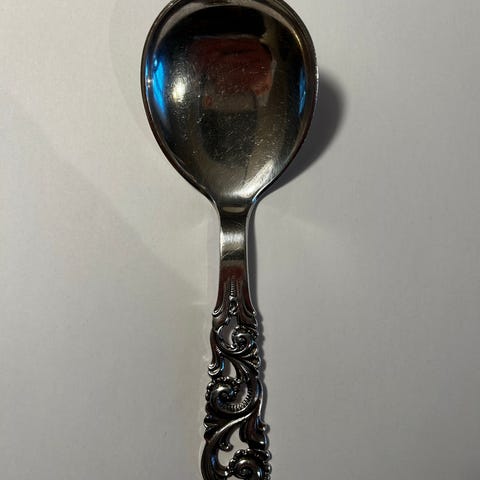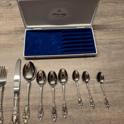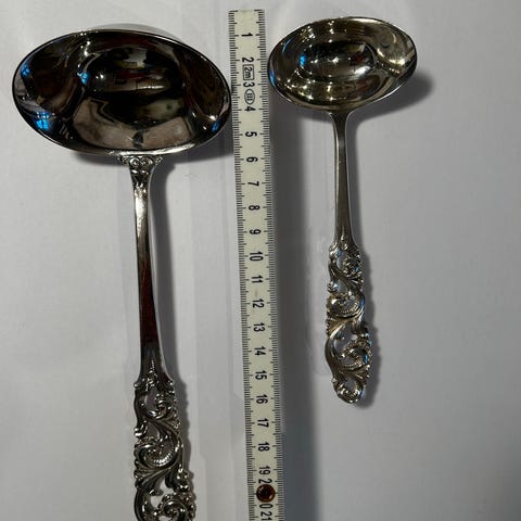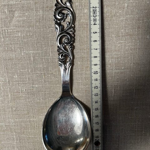 Har også koldtgafler, paispader, sukkerskjeer, stor anretningsskje 21,5, syltetøyskjeer 12,5 og 14,5, smørgafler, liten serveringsspade, kakegafler 13,8, ostehøvel 22,5, potetskje 21,5,