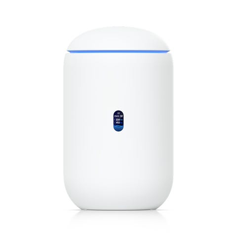 Ubiquiti UniFi Dream Machine er en hvit router med flere nettverksporter. Den har en kompakt og rund design, egnet for hjemme- eller kontornettverk. Enheten støtter avansert nettverksadministrasjon og sikkerhet.