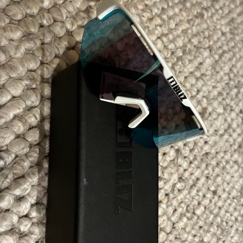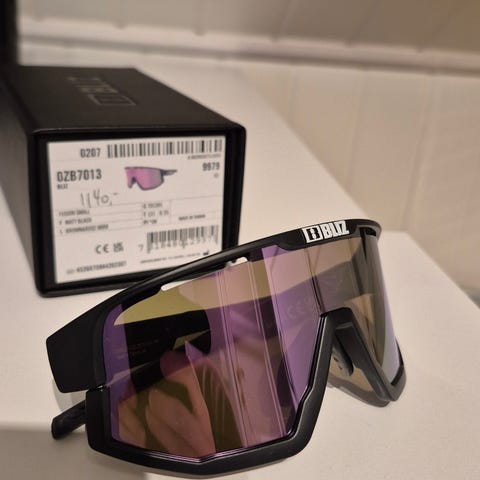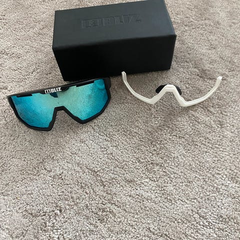 Bliz Fusion solbriller brukt et par ganger. Produktnummer: 52105-10. Matt Black frame og smoke with blue multi lens. Medfølger hvit ramme til å bytte på nederkant av brillen og nesedel. Brilleetui og boks.