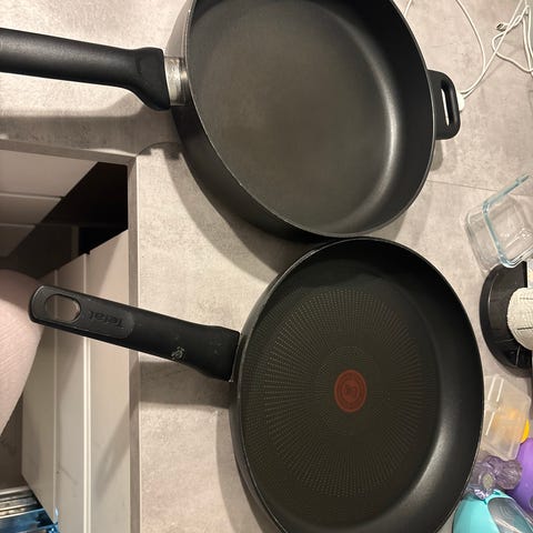 To fra Tefal med avtagbart håndtak og en mindre til å steke egg eller lignende.