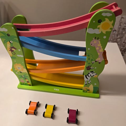 Passer for barn og gir mulighet for lek og motorisk utvikling. Tårnet har flere nivåer med spiralbaner i ulike farger. Det følger med to biler.