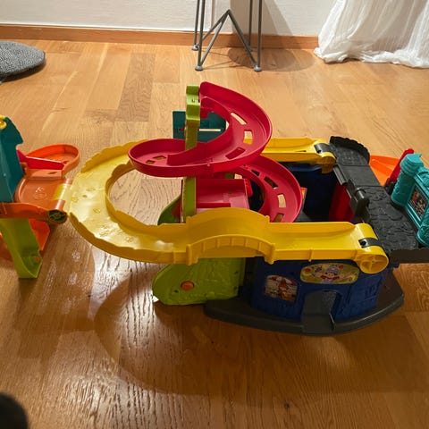 Fisher-Price little people biltårn med fargerike spiraler, hvor bilene kan settes på toppen og kjører selv ned.