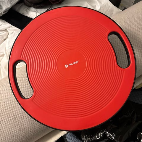 Abilica balanseskive i blå farge. Designet for balanse- og stabilitetstrening. Har en rund form med knotter på overflaten for bedre grep. Utstyrt med håndtak for enkel transport.