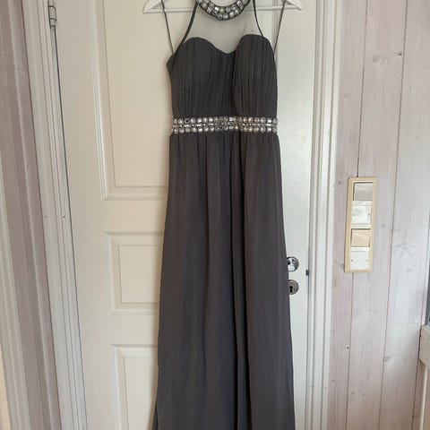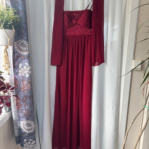 Nydelig selskapskjole med 3/4 lange ermer og blondedetaljer. Brukt to ganger. Passer small / medium. Sjal i samme farge hører til. Nypris 2.298 kr på Floyd.no