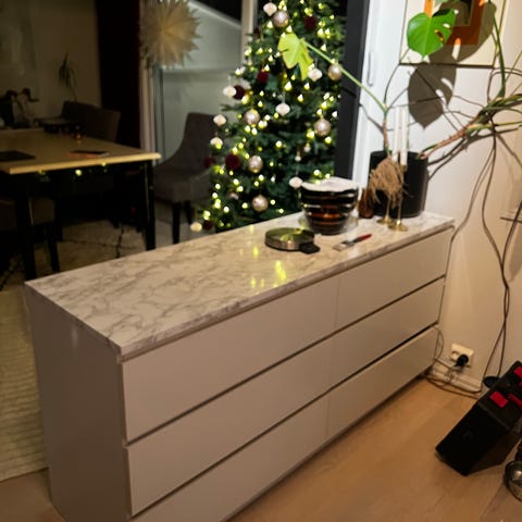 Selger en IKEA nordli kommode med 3 små og 3 store skuffer. Brukt som «klesskap» på barnerom, og rommer mye. Den er malt i fargen «Sand». Alle skuffene fungerer som de skal, den har noen bruksmerker på toppplaten og en flenge i treverket på venstre kortside. Konturer av skruer synes på den største skuffen. Det påvirker ikke funksjonaliteten.