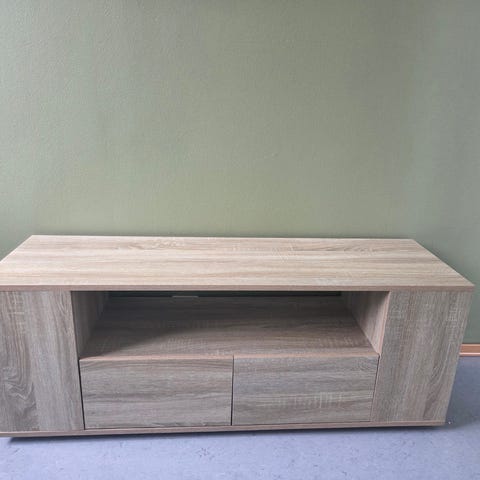 Et trebord med avtakbar topp til TV; pris kan diskuteres.