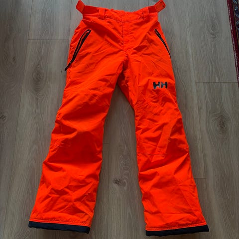 Helly Hansen Legendary Pants Junior i størrelse 164/14. Farge Neon Orange, så dette er buksen for de som vil synes i bakken. Det finnes noen flekker her og der. Har valgt å ikke vaske det bort foreløpig, for å beholde buksens vannavstøtende egenskaper bedre. I tillegg er det en liten rift nederst der stålkantene nok har kommet borti. Men buksen er i god stand.