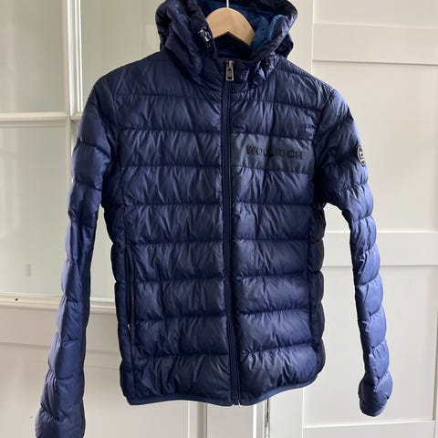 God og varm dunjakke fra Woolrich. Mørk blå farge som nesten ser svart ut. Pels på hetta. Noen bruksmerker som vist på bildene. Str 14 år.