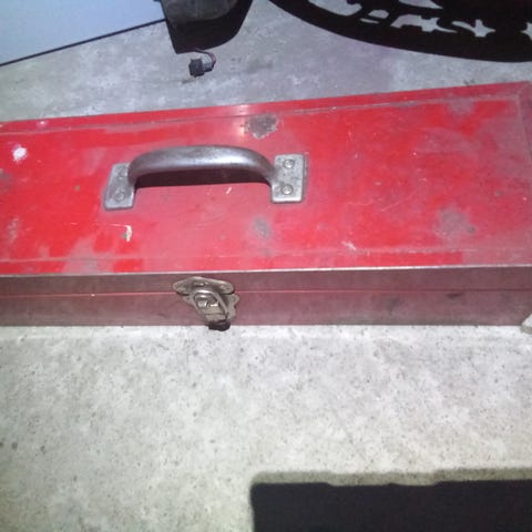 Verktøykasse med gul og svart lokk som inneholder ulike håndverktøy inkludert skiftenøkler, skrutrekkere, pipenøkler og annet verktøy. Verktøyene er i metall og plast, og egner seg for generell bruk i reparasjoner og vedlikehold. Noe Stahlwille, Sandvik, Helo, noe Biltema og annet.