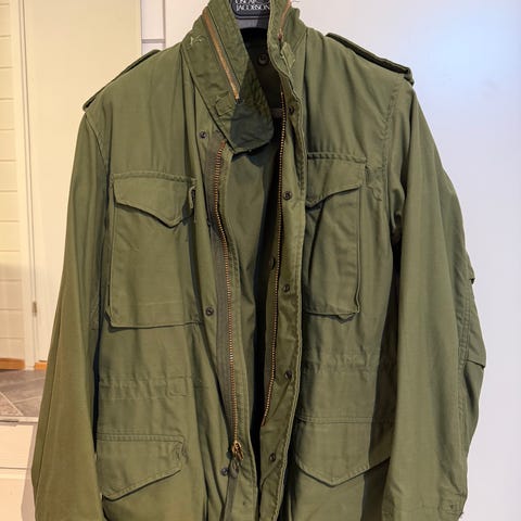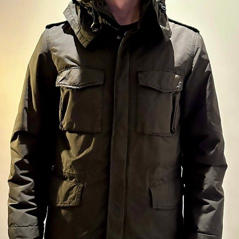 Selger en råtøff feltjakke fra det italienske merket Aspesi, kjent for sin tidløse, militær-inspirerte stil og kompromissløse kvalitet.