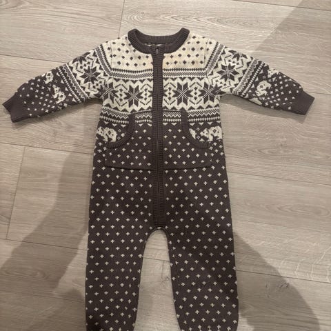 Plagget har knappelukking foran og mønsterdetaljer i øvre del. Merinoullen gir varme og komfort. Et lite hull som kan sys, se bilde.