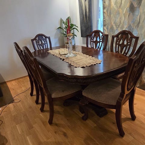 Selger et nydelig og solid spisebord med 6 matchende stoler i klassisk stil. Bordet har vakre detaljer og en tidløs utforming som passer like godt i tradisjonelle som mer moderne hjem.