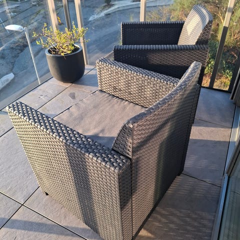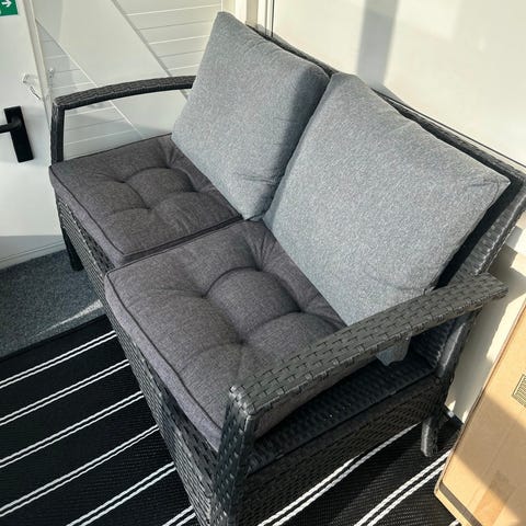 Utemøbelsett bestående av et bord og en toseters sofa. Settet er egnet for utendørs bruk og har puter på sofaen for komfort. Bordet har en flettet struktur på overflaten. Merk at det er enkelte bruksmerker som vi ikke får bort på bordet.
