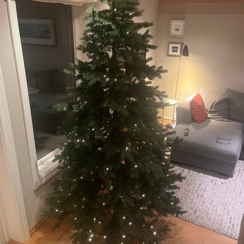 Kunstig juletre høyde 220cm og 150cm bredt i bunnen selges. Kjøpt på Hadeland. De store nostalgiske lysene og juletrepose følger med. Juletrefot er selvfølgelig også inkludert. Kjøper må hente selv.