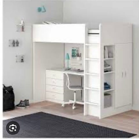IKEA Loftseng barnemøbel i hvit farge. Består av en seng i høyden med integrert trapp og skrivebord under. Laget av trebasert materiale. Passer for barn. Delvis demontert. Må hentes. Kan være at seng avviker noe fra IKEA sitt eget bilde(eldre modell), men ser relativt likt ut.